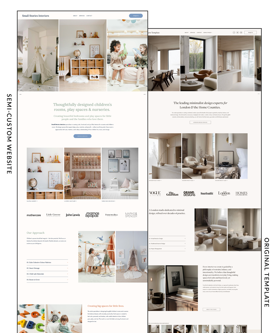 Fully custom Squarespace websites involve bespoke design from scratch rather than a template. They include more pages, unique features and integrations, custom coding, on-going aftercare and multiple rounds of revisions, resulting in a higher price point and a 1-2 week build timeline.