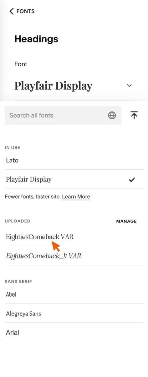 Once you navigate back out of the Upload window, you’ll see your newly uploaded fonts listed. You can now select which font you’d like to use. In this case, I replaced Playfair Display with a custom font called Eighties Comeback.