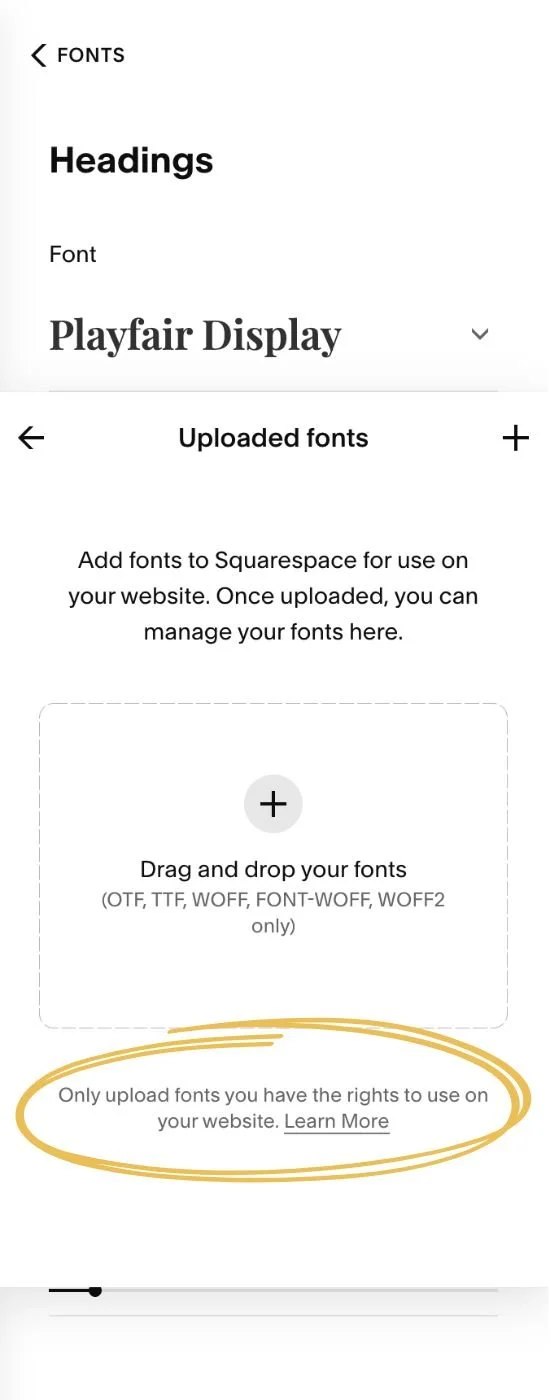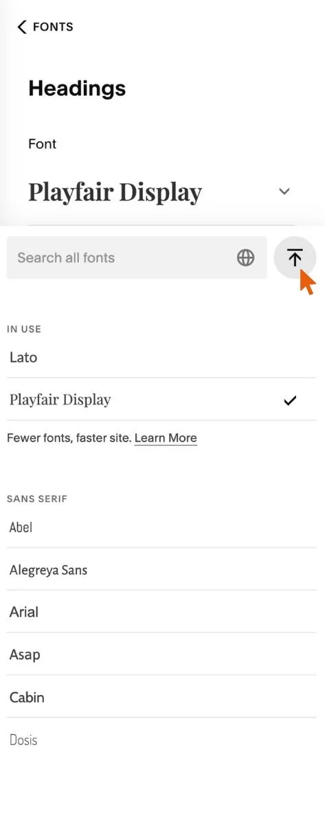 After entering the Headings panel, click on the font currently being used. A panel will appear for me to select a new font. To the right of the search bar, there is now a new upload icon, click on there and you’ll see a box to drag and drop your new files. You should drop all the font files you wish you use – this may include multiple weights, and normal and italic versions. Once they are all uploaded, you can click the back arrow. Warning: You should only use font files that you have rights to. This means you have either purchased the font files, or they are free to use. If you have a website designer or branding designer, you can check with them for clarification around this.