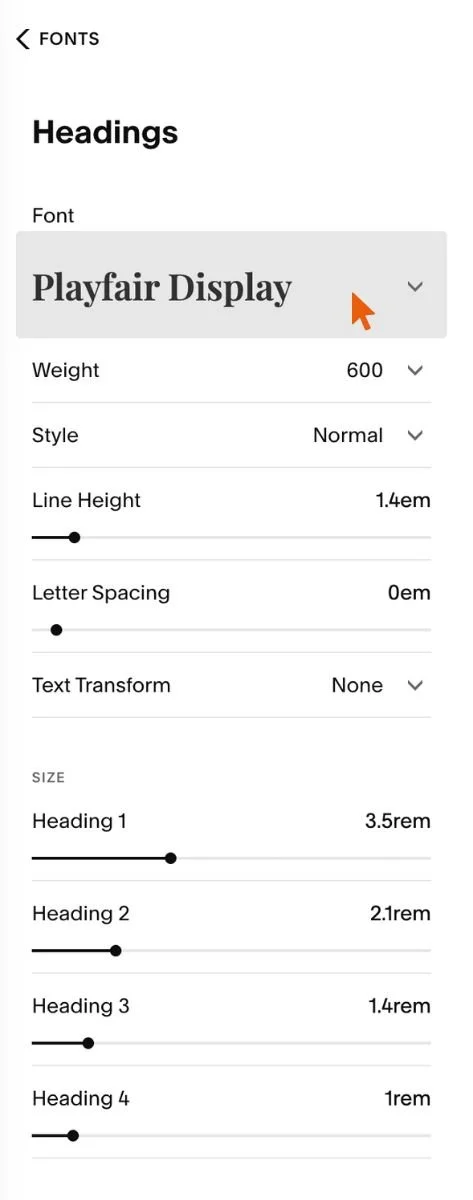 The first step is to navigate to the Fonts Panel in the Site Styles Panel. You can get here by heading to Website > Site Styles in the main menu, or by clicking the small paint brush icon in the top right-hand corner of the Squarespace editor. Once you’re there, you want to go into your Headings, Paragraphs, Buttons, etc panel – it’s most convenient to choose whichever of the font styles you’re looking to replace with a custom font, but you can upload all your fonts at once and then go into the relevant panels to assign them to different areas on your site.